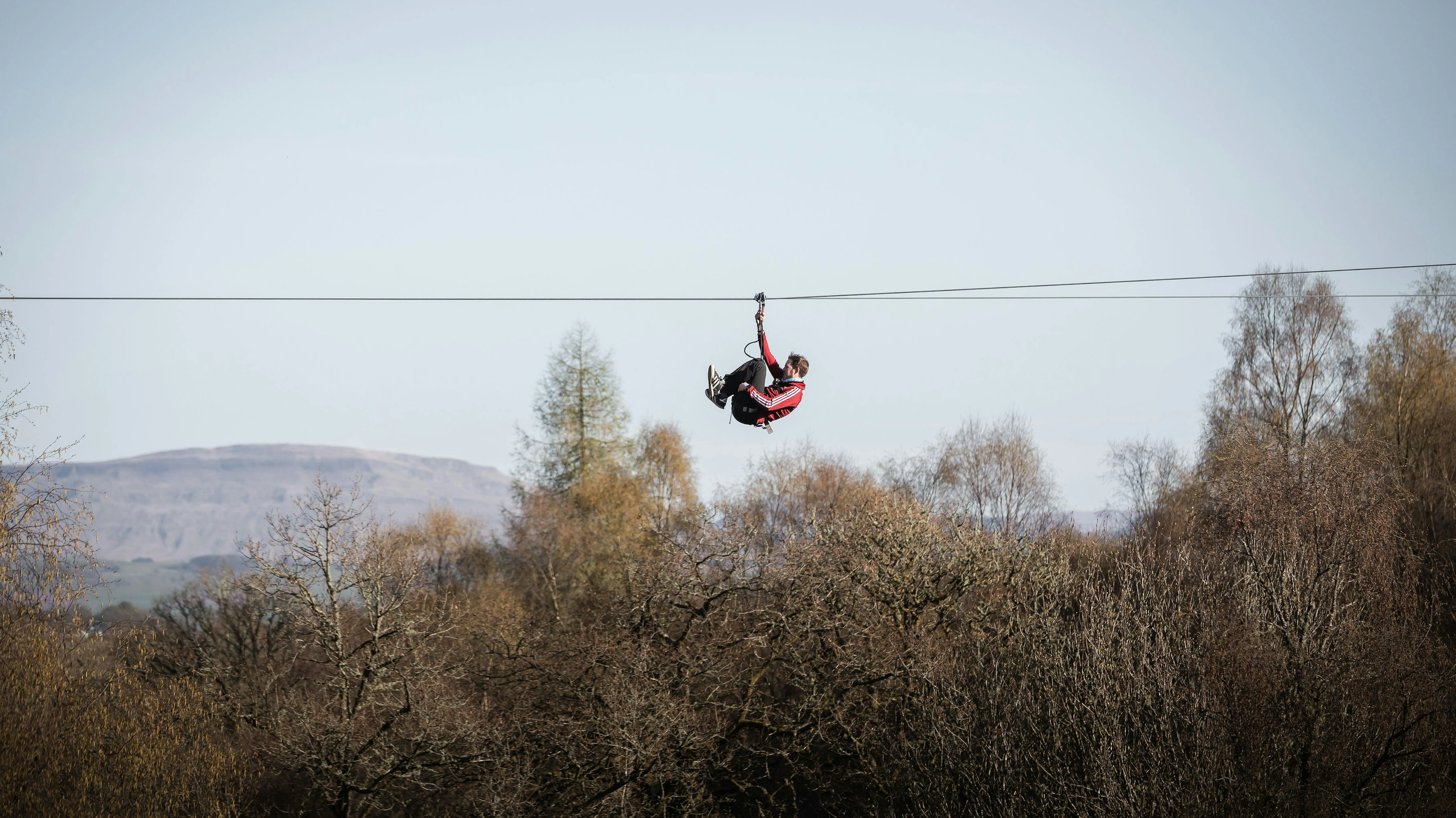 Person on a zip wire in the distance surrounded by trees.